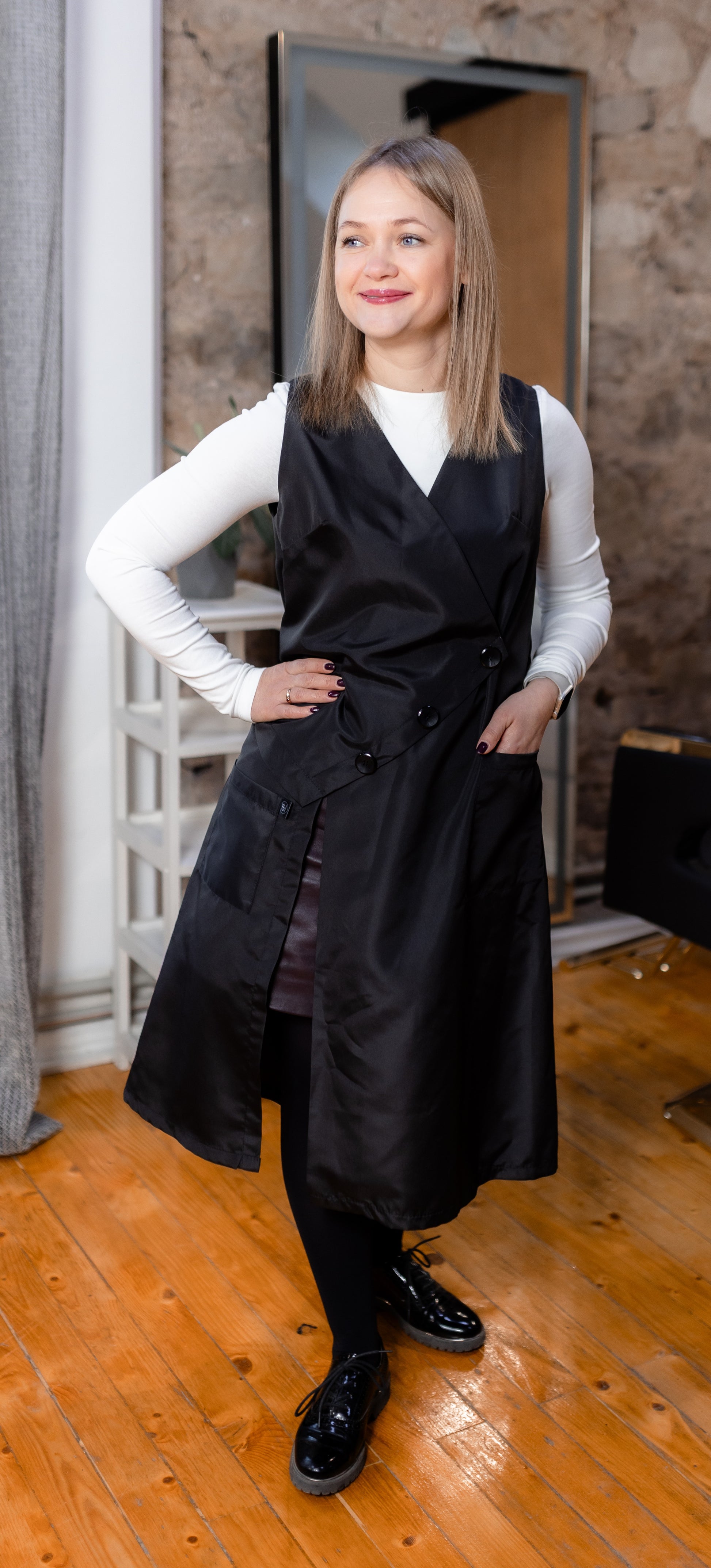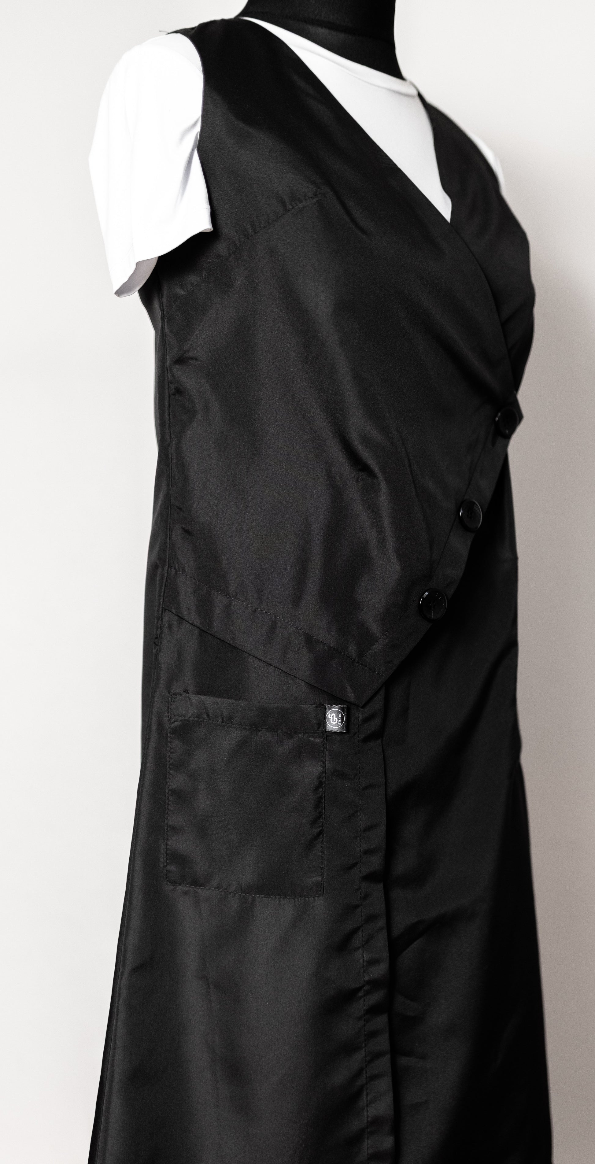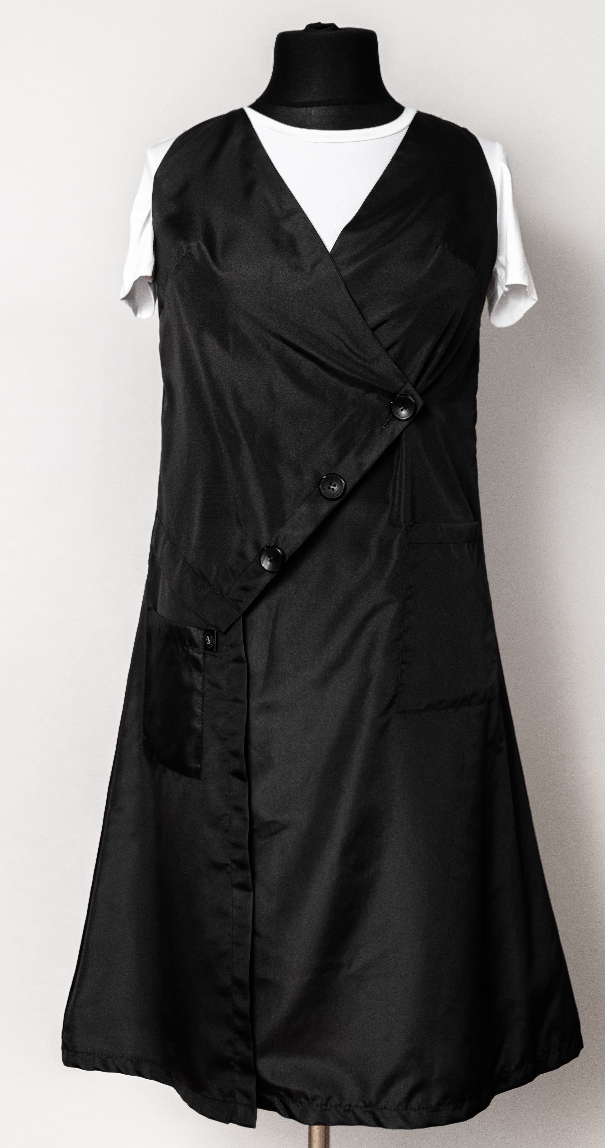 Mūsdienīgs halātveida piegriezums nodrošina vieglumu un pārliecību ikdienas darbā, savukārt praktiskās kabatas piedāvā ērtu vietu darba piederumiem.